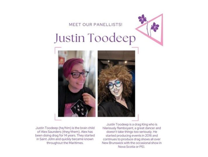 “Justin Toodeep (he/him) is the brain child of Alex Saunders (they/them). Alex has been doing drag for 14 years. They started in Saint John and quickly became known throughout the Maritimes.”