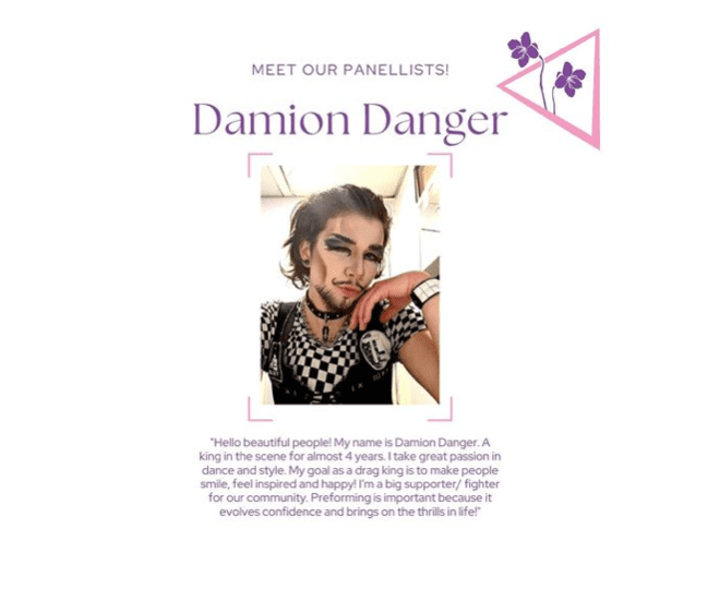 “Hello beautiful people! My name is Damion Danger. A king in the scene for almost 4 years. I take great passion in dance and style. My goal as a drag king is to make people smile, feel inspired and happy! I’m a big supporter/ fighter for our community. Preforming is important because it evolves confidence and brings on the thrills in life!”