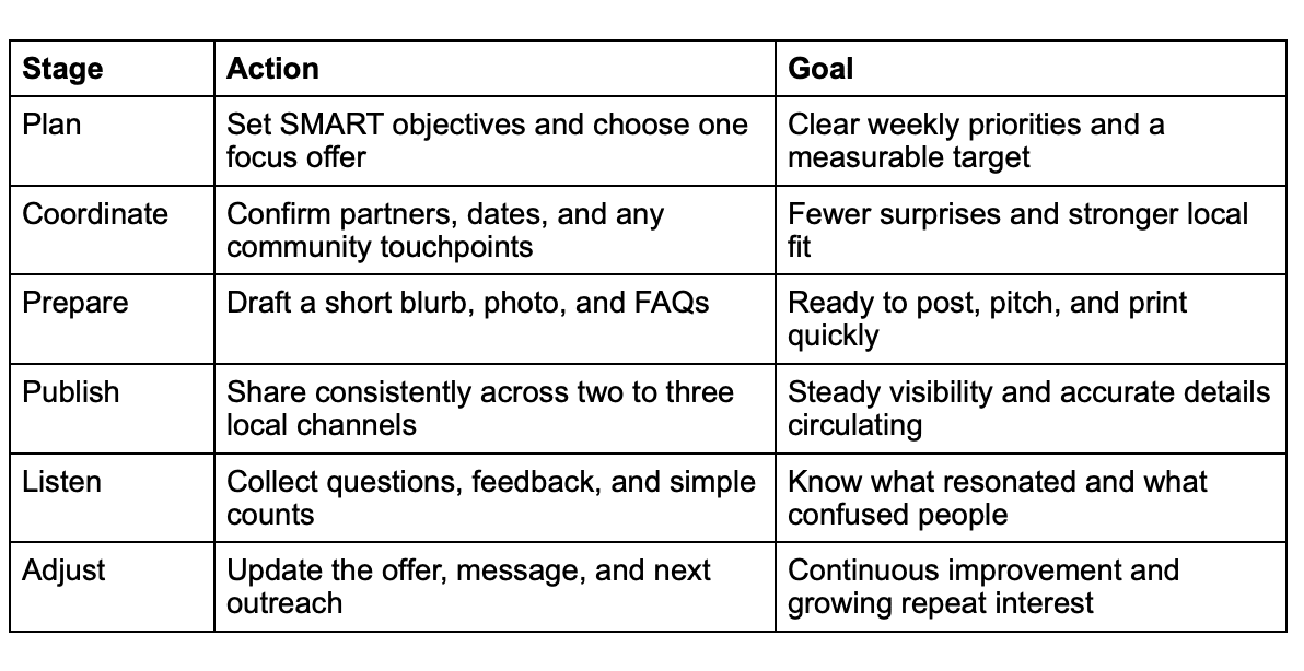 • Use community storytelling to earn trust (and improve your offer): Once a week, Share one short story that highlights your values: a customer win, a behind-the-scenes fix, a community partnership, or a learning moment. Keep it specific, what happened, what you changed, what it means for locals, and invite feedback with a single question. Those answers become your Learn stage: they tell you what to improve and what people are already telling their friends.