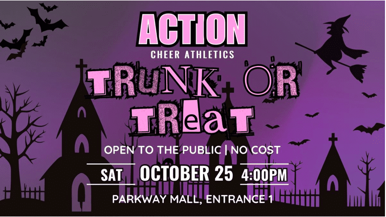 We’re so excited to welcome you back to our FREE community event. Bring the kids and/or grandkids to enjoy trunk-or-treating around our decorated trunks and learn more about Action Cheer Athletics!