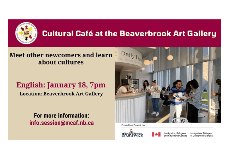 Meet other newcomers and learn about culturesEnglish: January 18, 7pm Location: Beaverbrook Art GalleryRegistration link: https://forms.office.com/pages/responsepage.aspx…00Post navigationPrevious Previous post: Branch Out and Weave for Climate Change: A Creative JourneyNext Next post: Café culturel au Musée des Beaux-Arts Beaverbrook