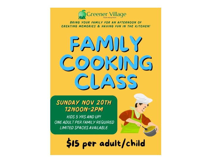 Family Cooking Class!! Open to families with children aged 5+ and up. Parents must be present to participate with their children as a family activity. Each family will have their own station where they will cook themselves through several recipes with the guidance of Chef Yves. This is a great way to start to reenforce healthy and budget friendly cooking to your children, maybe you’ll incorporate the recipes learned in your own weekly supper plans!