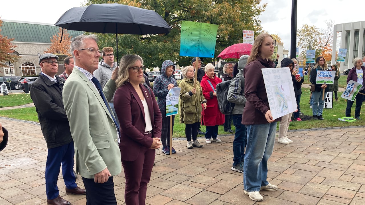Premier Susan Holt and Environment Minister Gilles LePage listen to people protesting outside the New Brunswick legislature against a proposed natural gas plant in the Tantramar area. (Jacques Poitras/CBC)