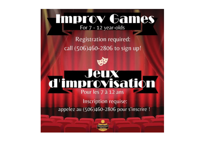 18 h 30 pour une heure de jeux d’improvisation super-ridicules. Les enfants auront l’occasion de pratiquer leurs talents d’acteur, de jouer à des jeux amusants qui les mettront au défi d’être créatifs sur le champ, et de se faire de nouveaux amis tout en le faisant. Les places sont limitées, alors appelez le (506)460-2806 ou envoyez un courriel à fpl-child@gnb.ca pour vous inscrire.