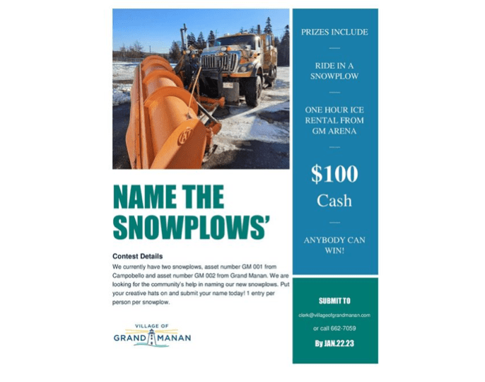 We need your help! We currently have two snowplows, asset number GM 001 from Campobello and asset number GM 002 from Grand Manan. We are looking for the community’s help in naming our new snowplows. Put your creative hats on and submit your name today! Submit to clerk@villageofgrandmanan.com or call 662-7059 by January 22, 2024