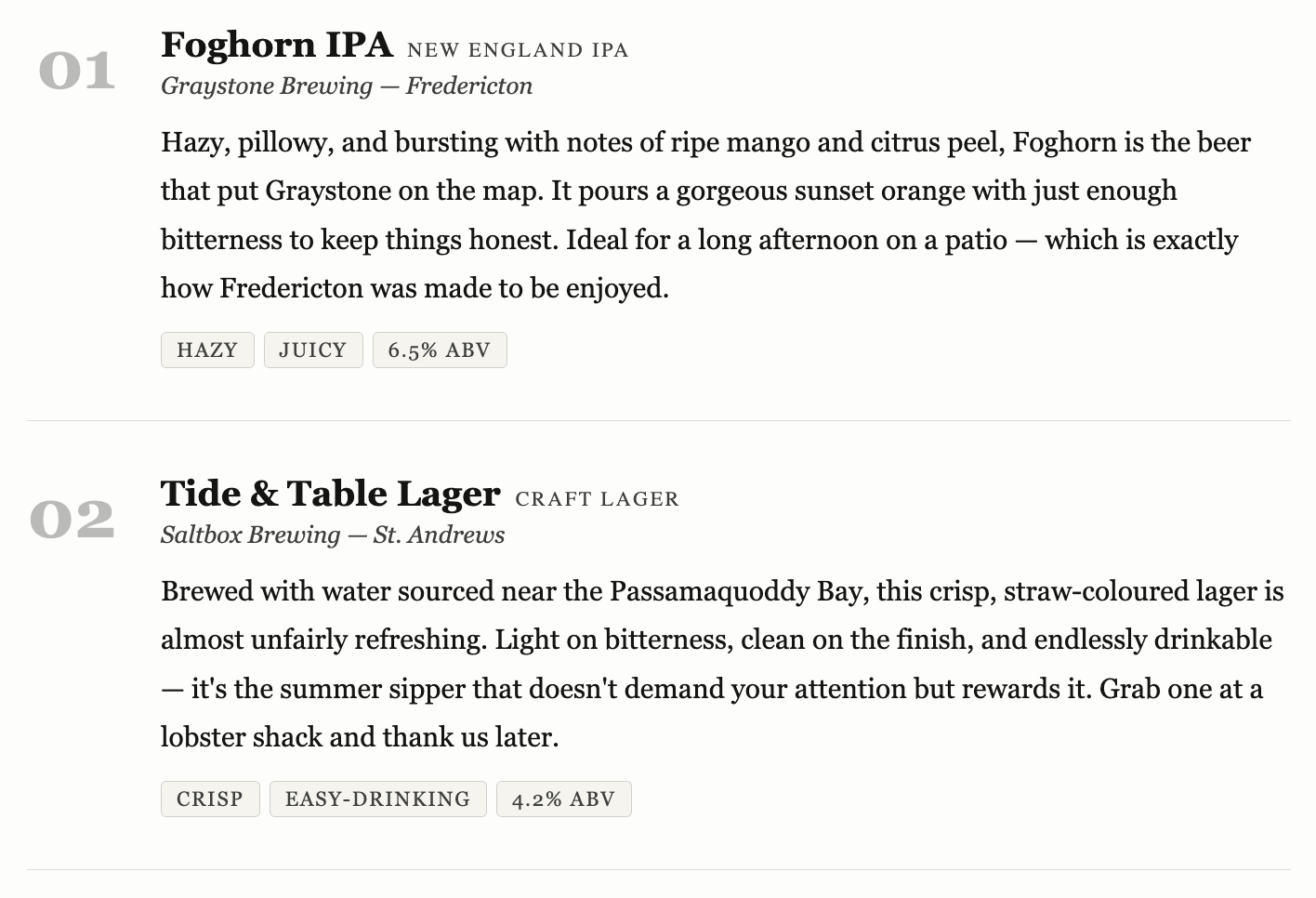 New Brunswick’s craft beer scene has quietly become one of the most exciting in Atlantic Canada. Small-batch brewers from Moncton to Miramichi are pouring their hearts into IPAs that bite back, sours that sing, and lagers so clean they taste like the Bay of Fundy looks. This summer, skip the imports. Here are the ten local brews worth seeking out — and where to find them.