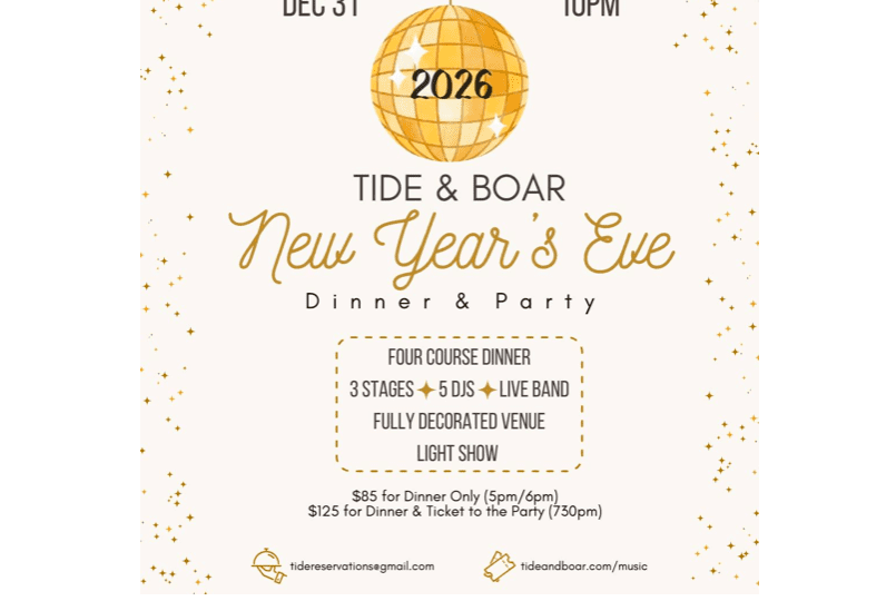 Celebrate New Year’s Eve at Tide & Boar Gastropub with a special four-course dinner, featuring options like Seared Beef Tenderloin and Seafood Pasta. Email tidereservations@gmail.com to reserve your table.