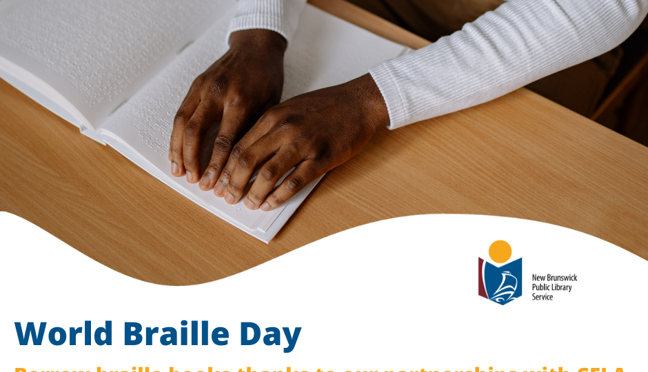 À l’occasion de la Journée mondiale du braille, nous aimerions vous rappeler qu’il y a plusieurs façons de lire un livre. Nous avons des livres en braille et des livres audio. Informez-vous au sujet de nos services ou contactez-nous pour en apprendre davantage ! http://www2.gnb.ca/content/gnb/fr/ministeres/bpnb/accessibles.html #JourneeMondialeBraille #gratuit