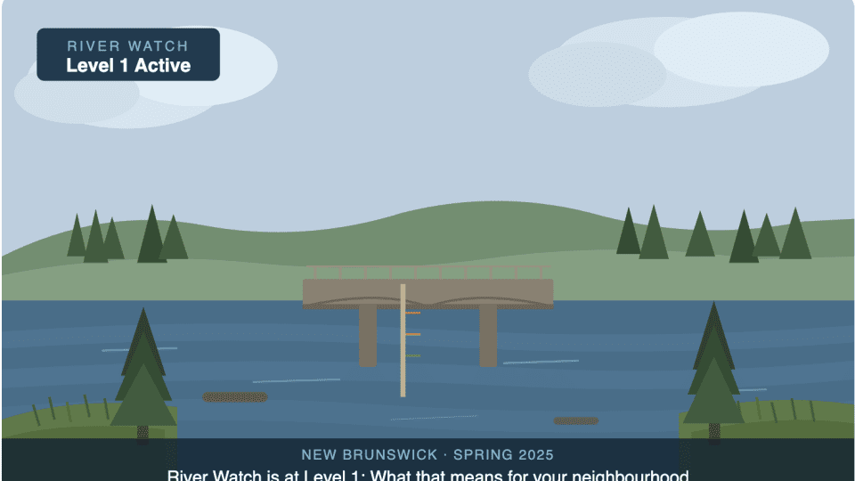 For current River Watch updates, visit the Government of New Brunswick’s River Watch page at gnb.ca or follow your local municipality’s emergency management channels.