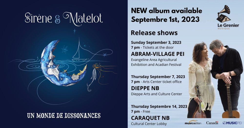 Patricia Richard, Lennie Gallant and their musicians will present three launch shows to introduce audiences to their new songs. First, they’ll be in Abram-Village PEI on Sunday, September 3rd at 7 p.m. as part of the the Evangeline Area Agricultural Exhibition and Acadian Festival. On Thursday, September 7 at 7 p.m., the show will be presented in Dieppe NB as part of the Arts and Culture Center season launch. And finally, on Thursday, September 14 at 7 p.m., the group will be at the Caraquet cultural center.