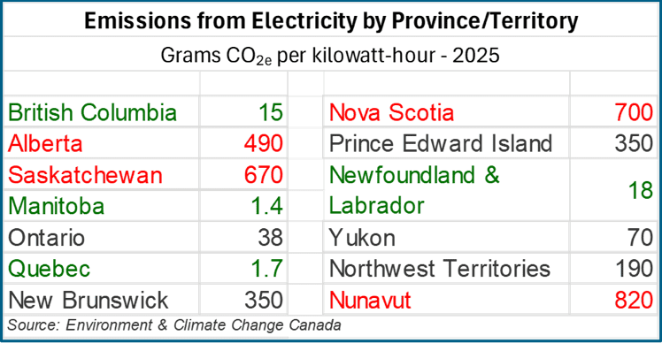 “An EV has a carbon footprint?” one may wonder. Yes, because often coal, oil or natural gas are used to generate at least some of the electricity used to charge it. But there are huge differences between provinces (as measured in grams of emissions per kilowatt-hour (KWH) of electricity):