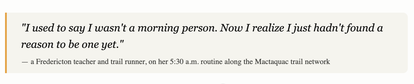 Fredericton is well-suited to this. It’s a walkable, liveable city with real natural assets — the river, the trails, the tree canopy — that reward early attention. It has the character of a place that’s still human-scaled, where the shift from sleeping city to working city happens gradually enough that there’s something genuinely worth experiencing in between.