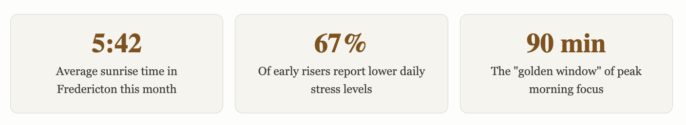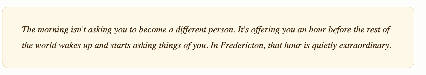 Across the city, from the Northside to the south end, from Brookside Drive to the Heritage Conservation District, Fredericton residents are quietly restructuring their mornings — and discovering that the hours between first light and the full rush of the day may be the most productive, most peaceful, and most distinctly their own hours they have.