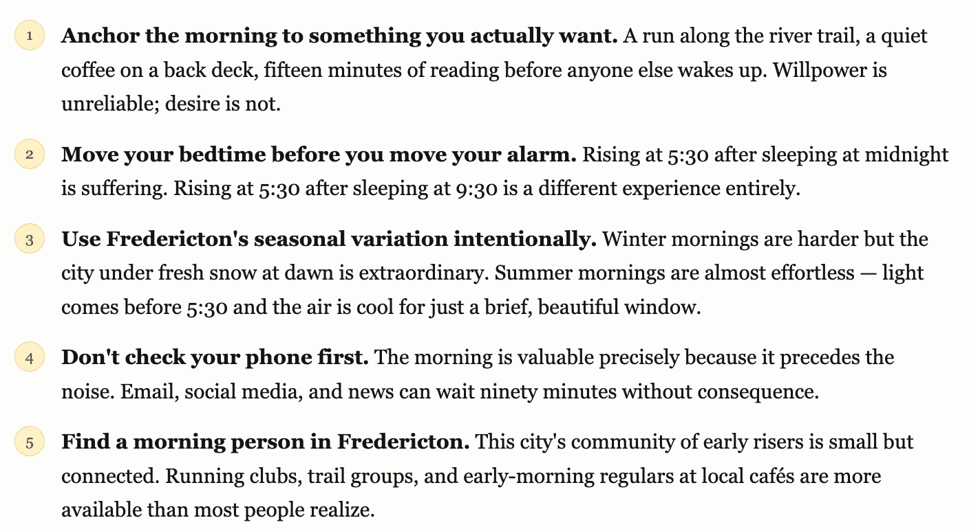 The pattern among Fredericton’s early risers isn’t one of grim discipline. Most describe a gradual, almost accidental shift: an early meeting that forced a changed schedule, a dog that demanded a 6 a.m. walk, a new job at a downtown office that made early transit more efficient. The habit took hold not because they forced it, but because the morning kept delivering something they hadn’t expected — a feeling of headstart, of ease, of ownership over the coming day.